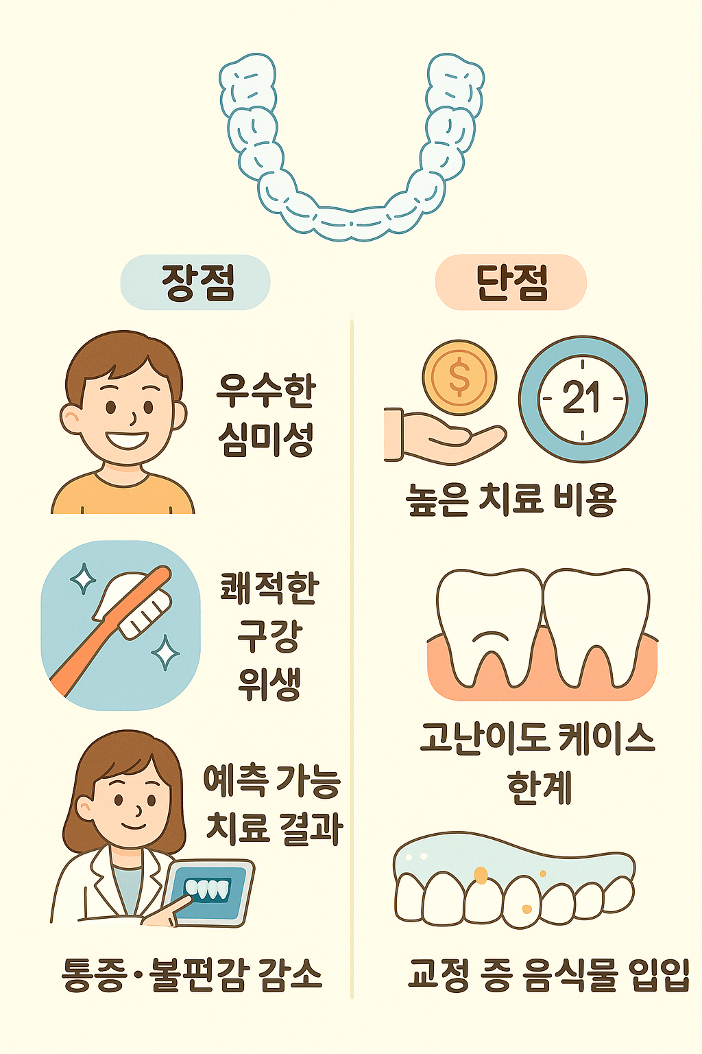 현대인에게 매력적인 교정 솔루션을 제시합니다. 그러나 비용·환자 순응도·적응 범위라는 한계도 분명합니다.