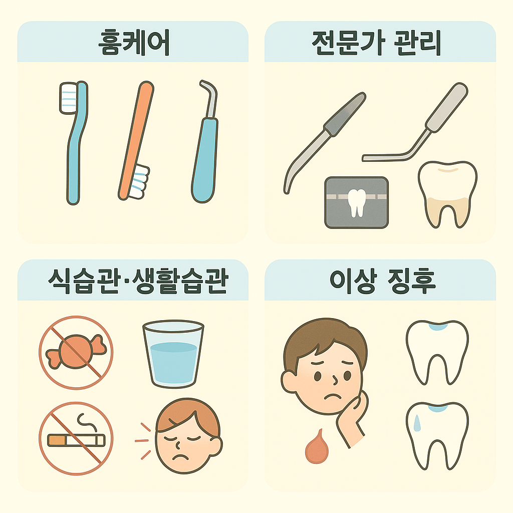 일상 홈케어(칫솔·치실·치간칫솔·워터픽), 전문가 관리(스케일링·방사선·탐침),