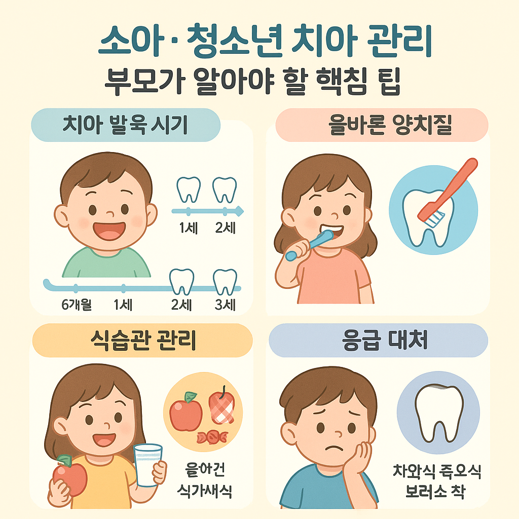 소아·청소년 치아 관리는 단순히 ‘칫솔질 잘하기’에 그치지 않습니다. 치아 발육 시기에 맞춘 정기 검진, 불소·실란트 활용, 올바른 식습관 및 생활습관 교정, 응급 대처법 숙지 등 다방면에서 부모의 관심과 노력이 필수적입니다. 이 시기를 거쳐 건강한 영구치를 지닌 아이는 평생 깨끗한 치아와 자신감을 누릴 수 있습니다.