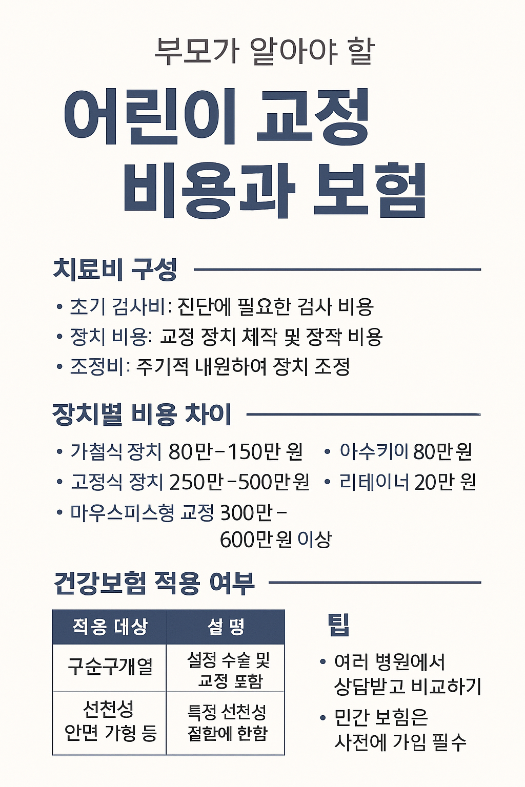 이번 글에서는 어린이 교정 치료비의 구성 요소, 장치별 가격 차이, 건강보험과 민간 보험 적용 가능성까지, 부모님들이 꼭 알아야 할 정보를 자세히 안내드립니다.