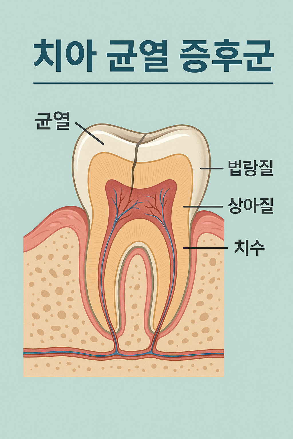 치아는 법랑질(Enamel), 상아질(Dentin), **치수(Pulp)**로 구성됩니다. 균열이 생기면 먼저 법랑질에 미세한 틈이 발생하고, 이후 상아질까지 균열이 퍼지면 씹는 힘이 치수에 전달되어 신경 자극이 발생합니다. 이때 염증 반응이 시작되고, 시간이 지나면 치근까지 금이 내려가 치아 구조가 분리될 수 있습니다.