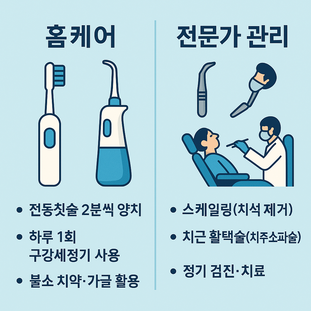 따라서, **‘홈케어 80% + 전문가 관리 20%’**의 조합으로 구강 위생 루틴을 설계하세요.