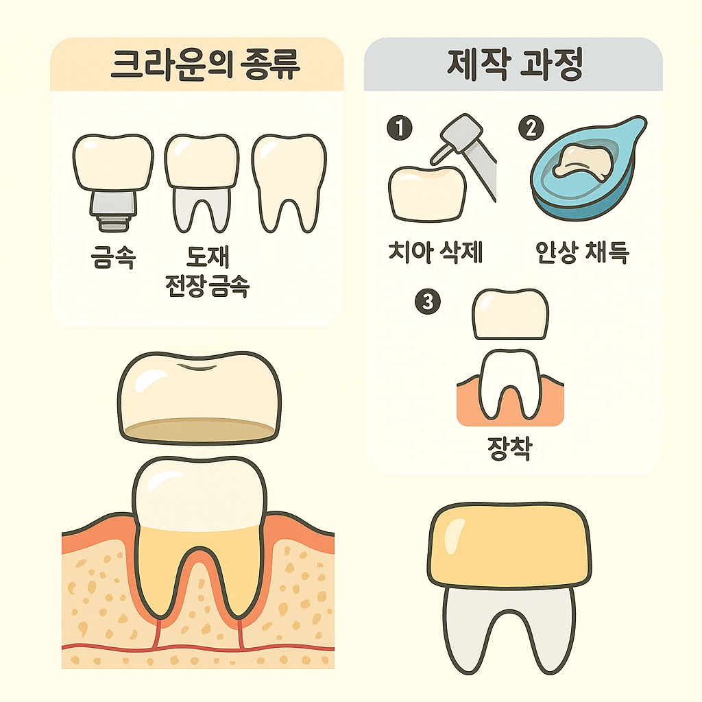 치과 치료에서 크라운(Crown)은 손상된 치아의 형태와 기능을 복원하고 보호하는 대표적인 보철물입니다. 흔히 ‘씌우기’라고 불리며, 치아 전체를 덮는 형태로 제작됩니다. 충치나 외상으로 치아의 구조가 크게 약해진 경우, 또는 신경치료 후 취약해진 치아를 보호하기 위해 사용됩니다.