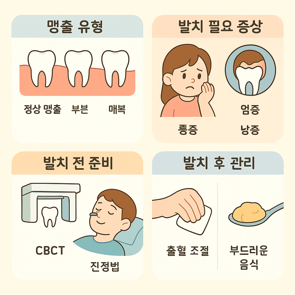 - 정상 맹출: 잇몸·턱뼈 공간이 충분해 곧게 올라옴