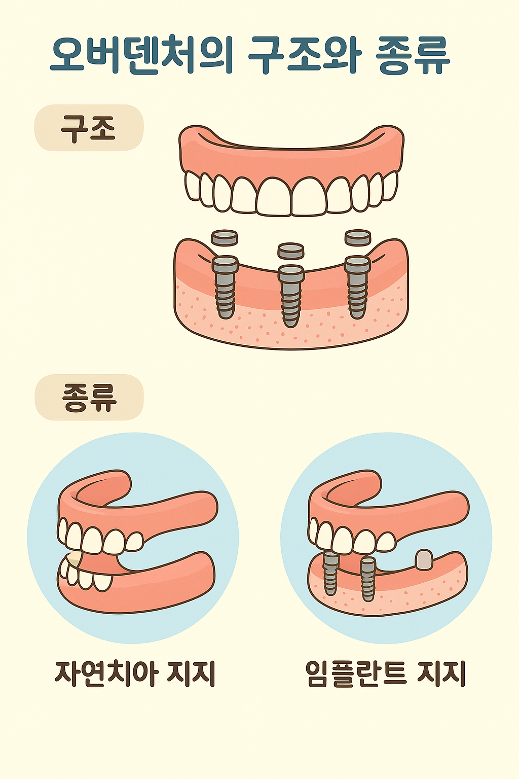 오버덴처는 말 그대로 **“덮어 씌우는 틀니”**를 의미합니다. 기존 잇몸 위에 올려놓는 완전틀니나 부분틀니와 달리, **임플란트나 남아 있는 자연치아의 뿌리(치근)**를 지지대로 사용합니다.