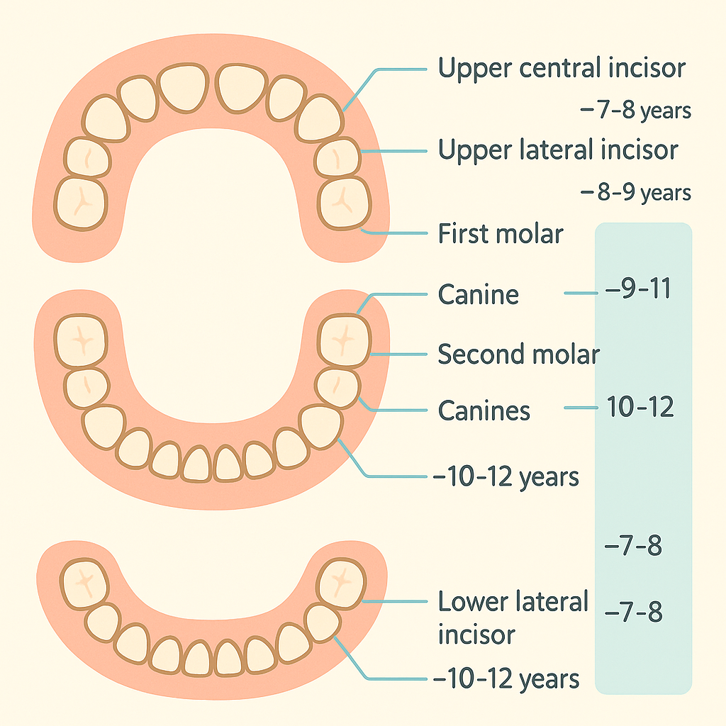 대부분 유치는 만 6세부터 12세 사이에 빠지며, 전형적인 탈락 순서는 다음과 같습니다.