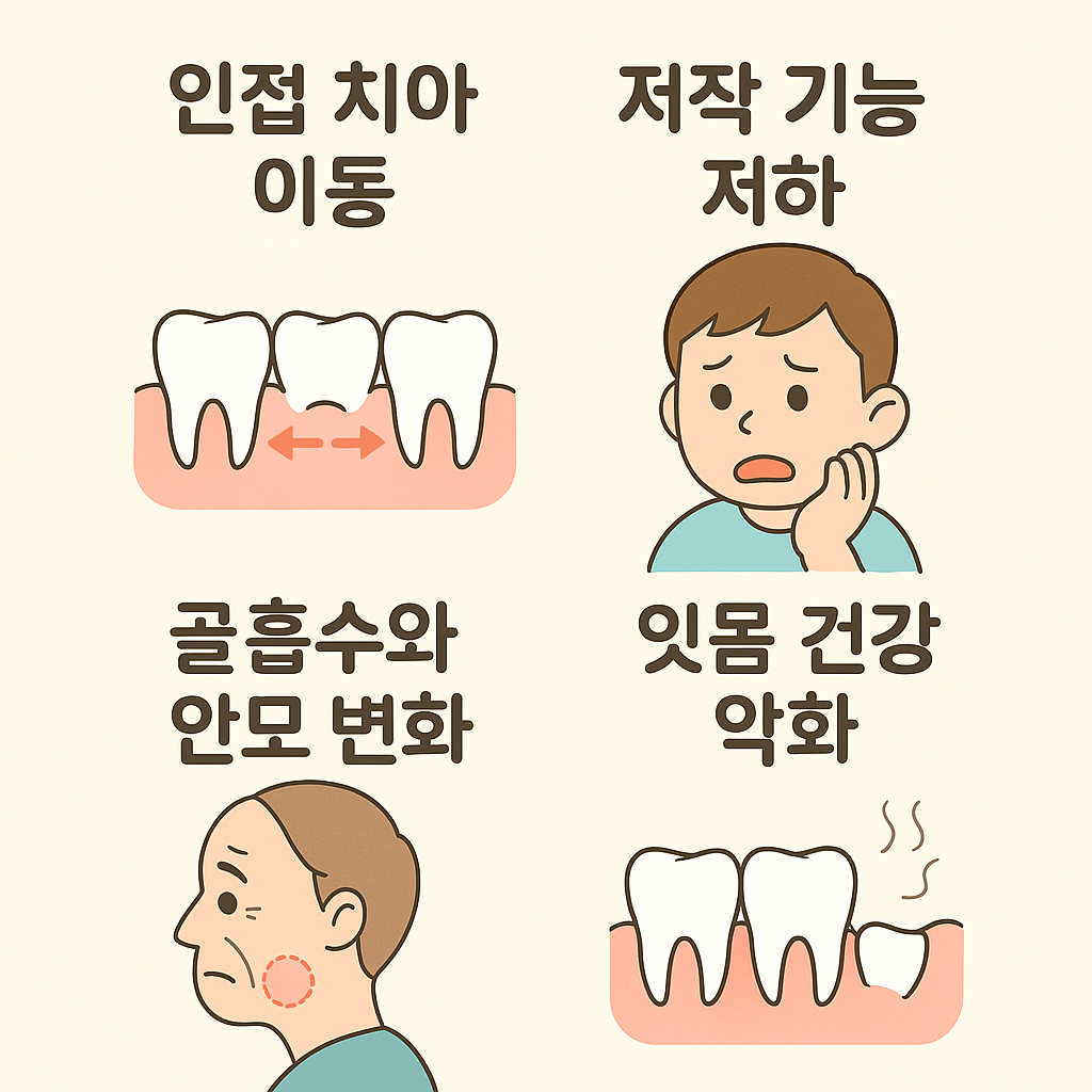치아가 빠진 부위는 턱뼈(치조골)가 점차 흡수되어 양이 줄어듭니다. 이는 틀니·임플란트 시술의 난이도를 높이고, 심한 경우 얼굴 형태 변화를 유발합니다.