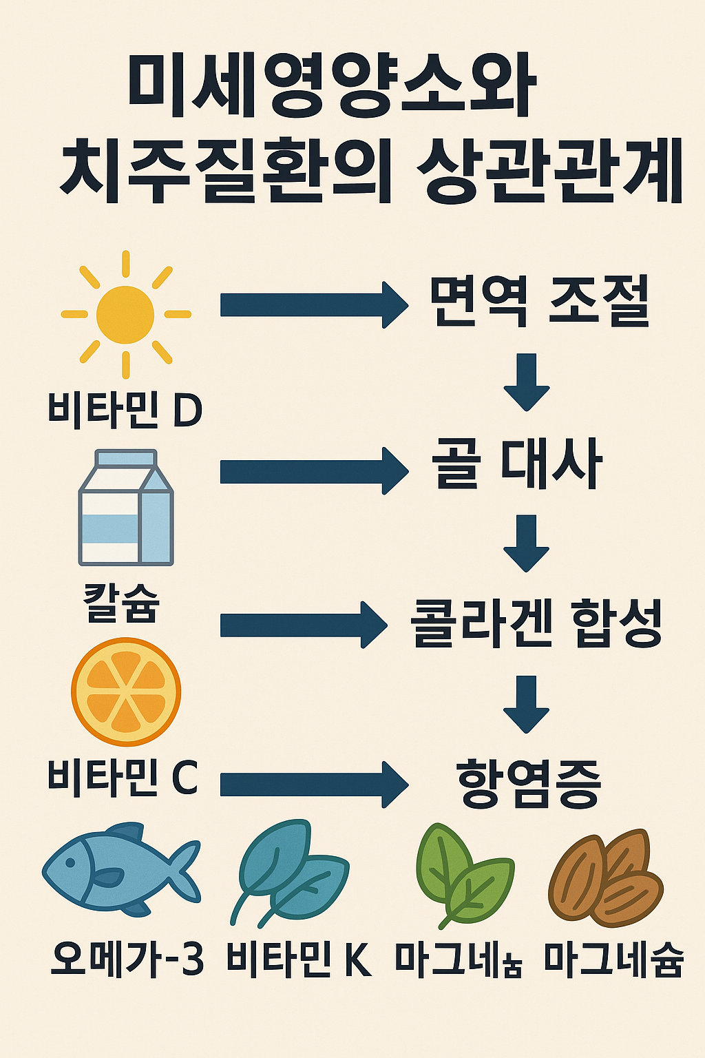 치주질환은 세균 감염과 숙주 반응이 복합 작용하는 질환이므로, 단순히 플라그 제거만으로는 충분치 않습니다. 비타민 D·칼슘을 비롯한 미세영양소는 면역 조절과 치조골 대사에 직접 관여하여, 치주염의 예방과 치료를 돕습니다.