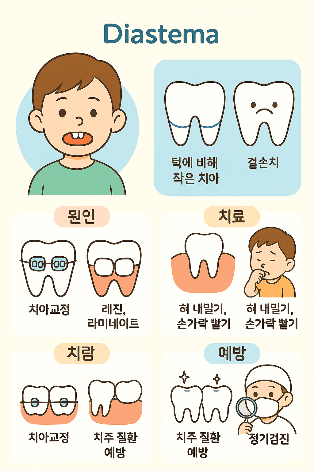 • 어린이의 경우 유치가 빠지고 영구치가 나기 전 일시적으로 틈이 벌어질 수 있습니다. 이는 정상 발육 과정으로, 대부분 시간이 지나면 자연스럽게 닫힙니다.