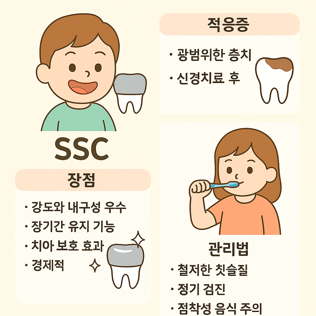 SSC는 치아의 전체를 덮는 **금속 재질의 덮개(크라운)**로, 스테인리스 스틸로 제작됩니다.
